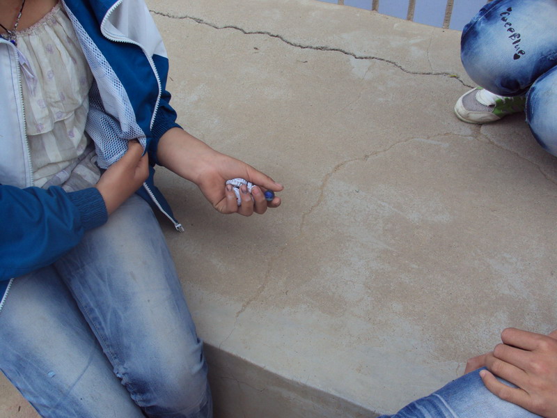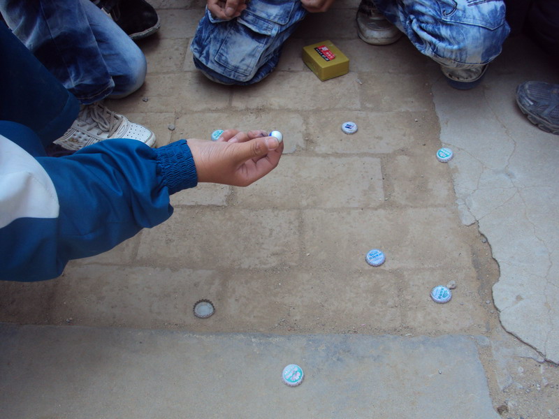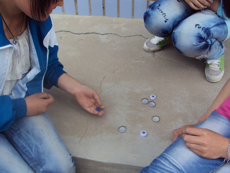 听"啪啦,啪啦——"清脆悦耳的声音,这肯定又有人在玩酒瓶盖了。瞧!那不是有几个同学围在一起,玩得正起兴吗。只见唐燕文右手抓起一些酒瓶盖,哦,原来还有一个小小的玻璃球呢,先把玻璃球抛起来,紧接着再把酒瓶盖撒开,然后用手接住玻璃球,再抛玻璃球,把地上的洒瓶盖拾起来后接住玻璃球,但有一个规则,就是在拾起酒瓶盖的时候,要同时拾两个或两个以上,但是手不能挨着其它的酒瓶盖,否则就违规,难度是不小啊。