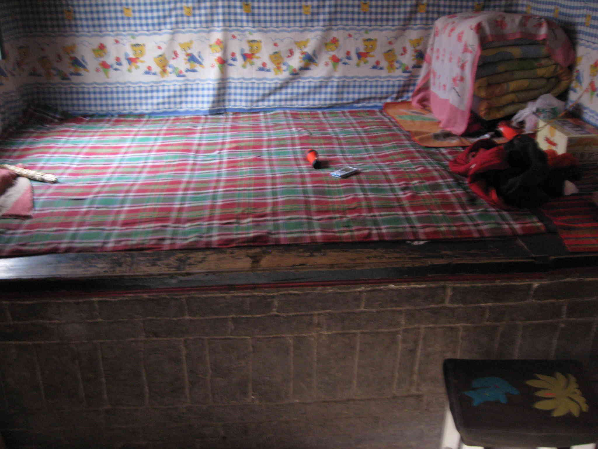 土炕是用土做的土坯一块一块垒成长方体,为了美观,人们常常用砖给它装个边子(甚至还)——这样既美观又实用的土炕就建成了。土炕中间是空的,是一个有固定形状的长方形通道,那是炕最重要的地方,冬天老人们在里面放上材禾,点燃后可以取暖的。在土炕上,铺一层厚厚的棉被,土炕的优点是产生的热量是均匀的,而且,热是慢慢传上来的,不容易引起火灾。