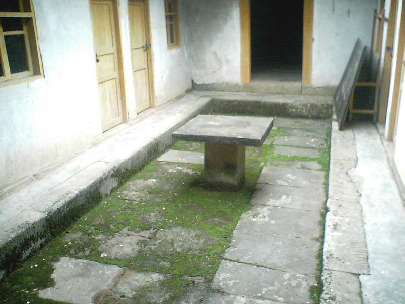 在古庙的门前有一个小坝子,在坝子的中央有一个小石桌,这个小石桌以前是用来供游人们休息的。在这个小坝子上由于年事已久,没有人来,所以地上长满了青苔。