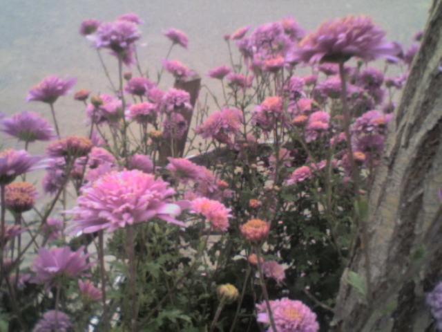 门口那大树附近,生长着无数各色各样的菊花,红的、黄的、白的。红的似火,黄的似金,白的如雪,朵朵傲霜吐艳,竞相开放,千姿百态,使人眼花缭乱,惊讶不已。这些叶子翠色欲滴,花朵很大,那金绒般的花瓣,有的向上卷曲,有的侧面伸展,各具特色,婀娜多姿。