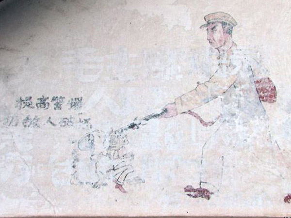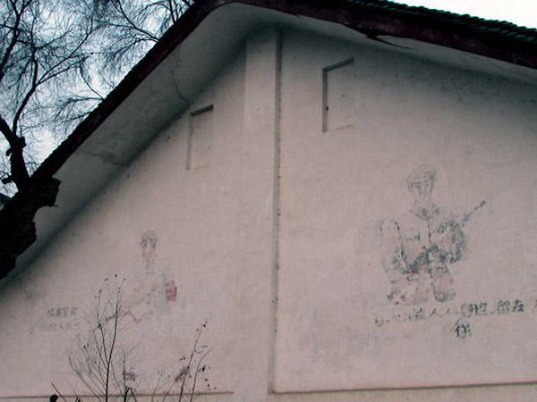 走近仔细瞧瞧,看到第一幅上画的是扛着枪的解放军,神态严肃,下面写着“小心敌人从你身边溜去!”,第二幅画的是一个解放军战士用刺刀去刺一个坏人,上面写着“提高警惕……敌人破坏”,这些画色彩鲜艳,人物栩栩如生,只可惜有些风化,很多看不清了。