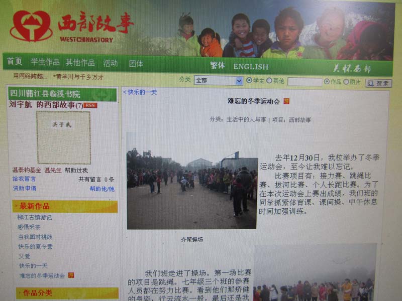 当他第一次帮助我进入西部故事的网站时,里面的作文令我眼花缭乱。我仔细阅读了几篇写得非常好的作文。写那些作文的学生年龄与我相仿,也大都是家庭收入十分微薄的学生。他们的文采不得不令我佩服,我当时就下定决心,一定要尽心尽力写好作文,尽自己微弱的一份力,争取使西部故事发展得更好。