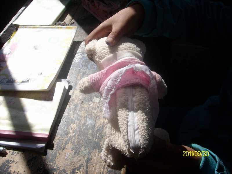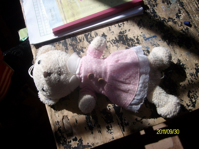它的外形是一个毛绒绒的小熊,它有一个圆圆的脑袋。眼睛黑溜溜的,一看就很聪明,嘴巴弯弯的,如果会说话,说的话一定会很甜。它穿着一个淡粉色的小裙子,上面还装饰着小木钮,雷丝边儿。它不仅好看,而且还很实用。你再看它的背后,你会发现一个拉链,里面可是一片不小的天地。这可是两全其美。