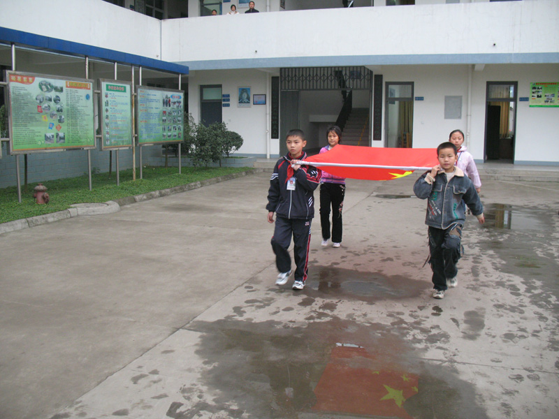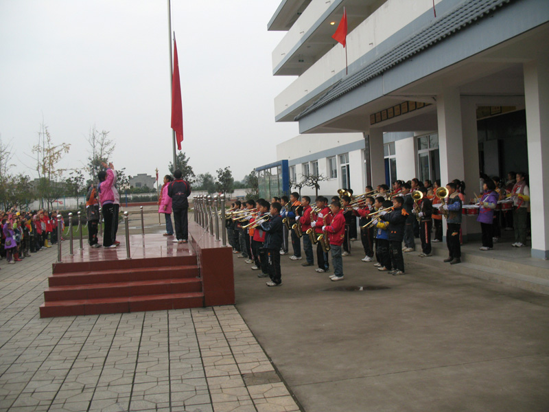 整理好队伍,主持人上场,今天来的一位小不点主持人,是三年级的一位小同学,个子不高,声音很洪亮。"立正",升旗仪式现在开始,出旗,奏乐。学校鼓号队奏起了进行曲,旗手昂步走向旗台。