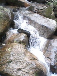 暮色降临,山谷里起了一层薄薄的雾,眨眼间雾气弥漫开来,整座山都笼罩在雾中,像一个蒙着面纱的害羞的姑娘。瞧!那茂密的灌木丛不正是她乌黑的秀发吗?山涧中流淌着一条小河,河水在棱角分明的石床上分散成三股开来,河水与石头间的冲击溅起一朵朵白色的水花,在空中绽放开来。