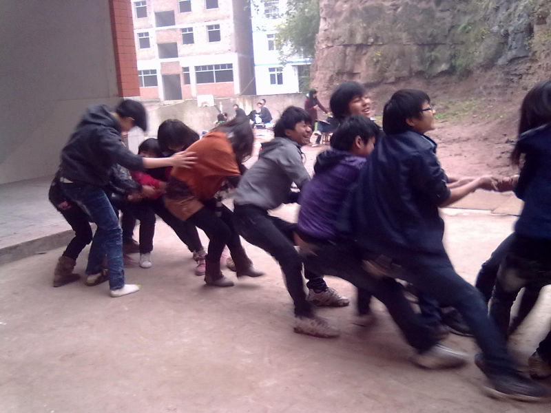 再一次那根绳出现了;再一次感受到那根绳带来的欢乐。我想尝试,我也想融入这个集体,于是顺着这根绳,顺着欢笑,我与他们共同参加了拔河比赛,那奋斗的劲儿,那齐心协力团结的力量。我深深感染了,那欢笑不仅属于他们的,也有属于我的啊!