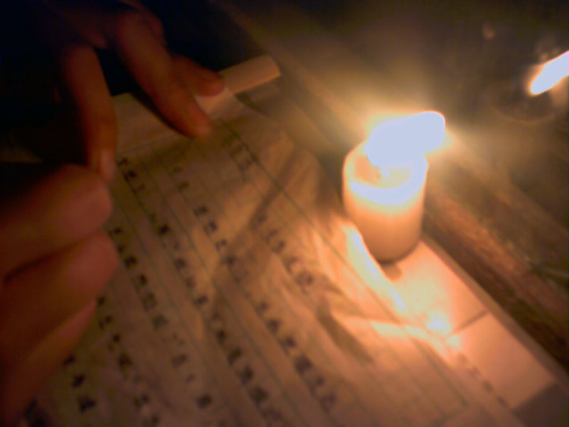 但事情好像并没有那么发展得那么糟糕,晚上我们来的时候,我们进班的时候,看到老师正在点蜡烛,不会吧?让我们点蜡烛学习?因为班里有很多蜡烛,有的人自己带了,所以几乎每张桌子上都有一根正在燃烧的东西。整个教室虽然很大,但却充满了烛光,感觉特别温暖,并且教室里异常的宁静,连喘气都很小心。