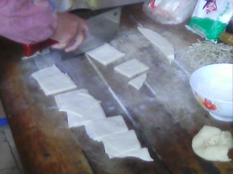 面已和好,妈妈快速的用面杖擀着雪的面团。当然包饺子才是今天最重要的事,妈妈边干活边说:“这面皮不能太簿也不能太厚”,当你仔细注视她在切面动作时,你会发现是那么的娴熟,簿簿的面皮在她手中变成了一幅幅可爱的小画。每当我看到这都有一种想动手大干?的冲动,最终我不得为这辛苦而领惜生活的不易,这礼物确实千金难买。