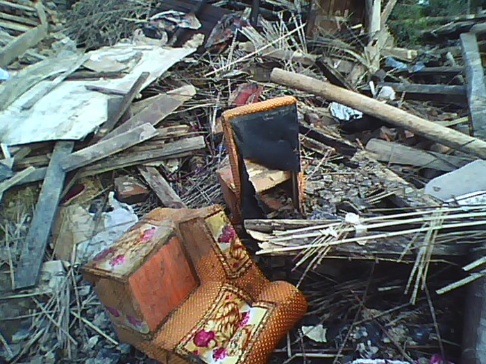 我就想:我该怎么走过去,没有办法,只有卷起裤脚,脱下鞋子,一步一步涉过去,这段难行的路不知不觉已走完,临近家门口心情异常兴奋。屋后的山坡滑下来,差点把我们的房屋掩埋,只剩下屋顶。我嚎啕大哭:老天为什么对我们这么不公平?为什么要摧毁我的家园,就连居留之所也要毁灭。