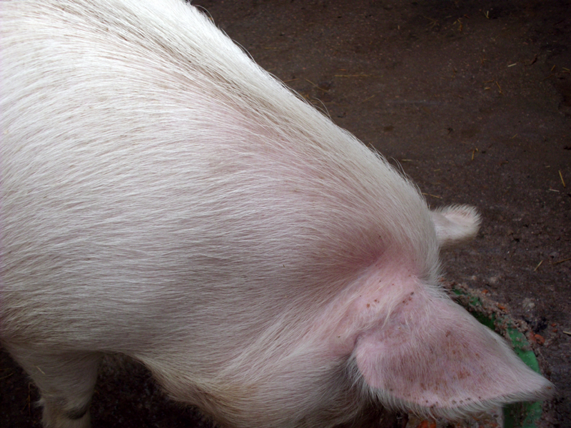 瞧,大白猪从猪舍里走出来了,打着哈欠,伸着懒腰,许是饿了,不然它会一直睡着,它是很懒惰的,一天的大部分时间都是睡觉。饿了就得赶快喂,不然它会大叫不止。猪的食量是很大的,一顿吃二三脸盆,所以人们写文章还用猪肚形容,说什么“虎头猪肚豹尾”。然而对喂养猪的人来说它吃得越多越高兴,因为不这样猪就有毛病了。