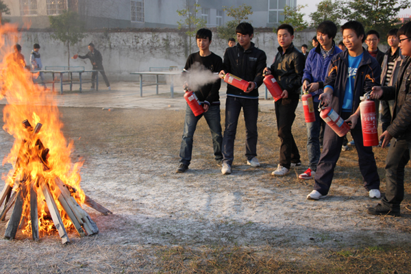 下午第八节课很快就到了,学校安保处在每个班挑选了几名代表,其余同学都去参观。到了操场,大家整齐地聚集在指定地点,并在中间堆了一些易燃品,做好准备工作。学校消防专干先为大家介绍了消防常识,并为大家示范了灭火器的使用方法。随后,消防专干用汽油点燃了易燃品,熊熊大火燃烧起来了,几名同学手持干粉式灭火器,在距火堆四米外的地方一起抽下保险栓,压下把手向火堆喷射干粉,白色粉尘弥漫着火堆,一会儿功夫就把大火扑灭了。四组同学分别上前演练了灭火器的使用方法,牢记火灾发生时的正确操作。