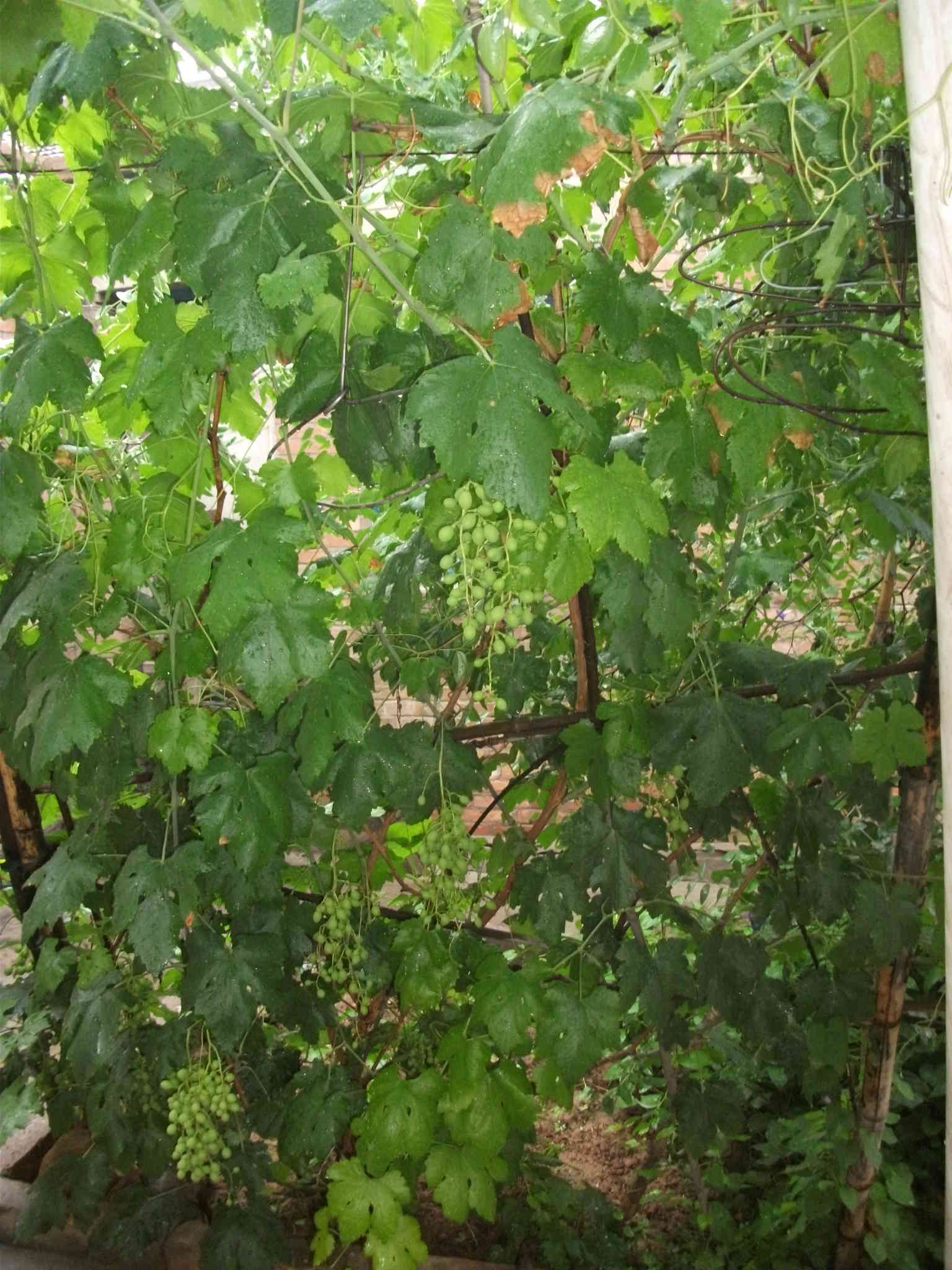花园的北面种着一排葡萄树,葡萄树下也可以乘凉,树上结满了晶莹透亮的一串串绿葡萄,葡萄藤沿着架子不断地往上爬,以至于激励我和姐姐时时刻刻奋斗不息,拼搏向上。