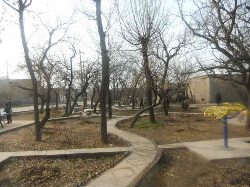 门前的枣树林已在年复一年的风吹雨淋中变得苍老。林间的青草被牛羊啃食的残缺不全,因为无人管理,树林曾一度成为堆放垃圾的场所。现在经过整治,已变成了一个小型的花园,年岁已久的树木和新近安放的健身器材让枣树林变成了孩子们游戏的场所。