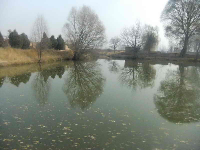 刚进入苗圃,首先映入眼帘的是一个人工凿成的水。冬日的寒风中,塘边的青草早已变得枯黄,凋零的树叶散落在深冬的塘面上,像一叶叶的小舟,又像水面上开出的朵朵小花。幽绿的水面,在冬日的刺骨寒中更显得清冷,凛冽。远处的树木模糊却又清晰。