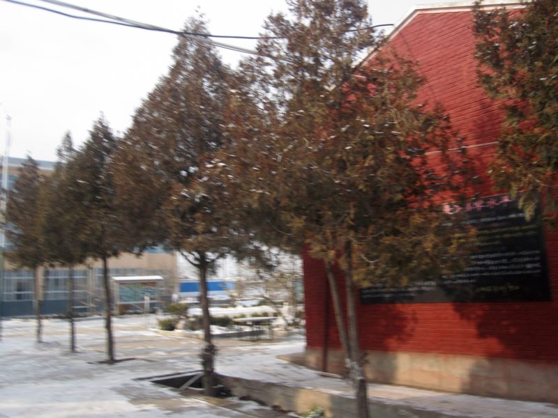 看,那马路上两旁的松树,整整齐齐,像两条绿色的绸带。在这寒冷的冬天里,为校园增添几分春的色彩……