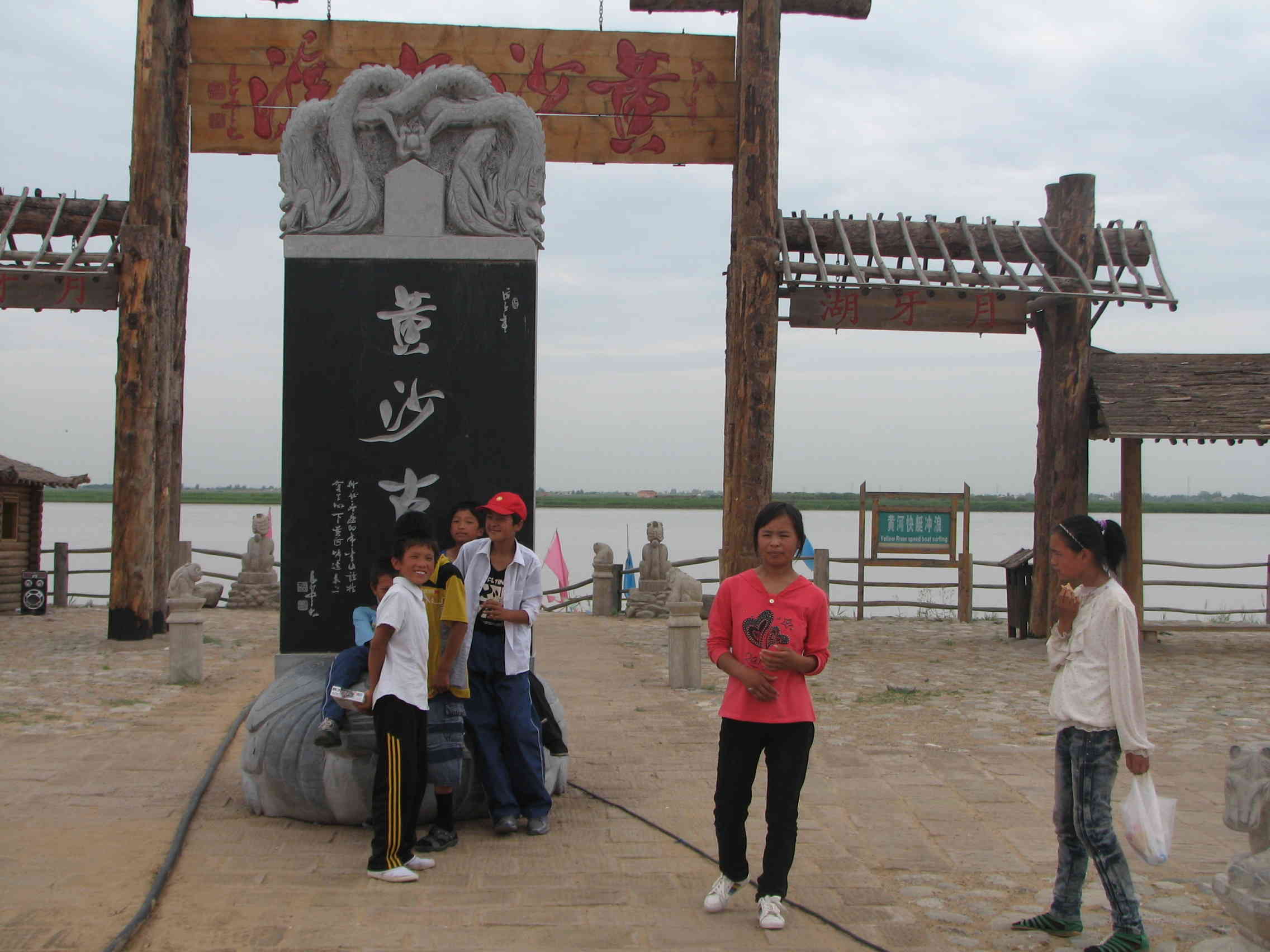 在大门外的一百米处,有一块大石头,上面是雕刻后用红色漆写在上面的四个大字——黄沙古渡。地下是用水泥筑起的高约1,6米的正方体底座,上面也用红色漆写了黄沙古渡四个字。正门前,周围是用草席搭成的凉亭,还有像小房子似的建筑。门口两旁建的像长城,管理人员不让进,说买票才可以进,无奈之际我们选择走后门。我们把自行车放到附近的人家出,向沙漠走去······