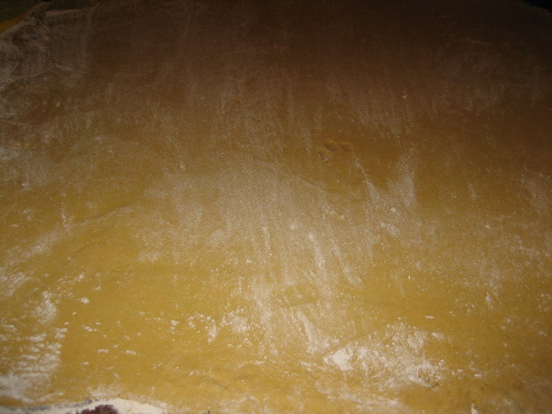 和好面后,用面杖把面擀成约3毫米溥厚的"面片"。擀面时可不能用力太大,否则擀出来的"面片"溥厚不均,烤出来的饼干会软硬不一,溥的地方太硬,厚的地方太软,那就不好吃了。