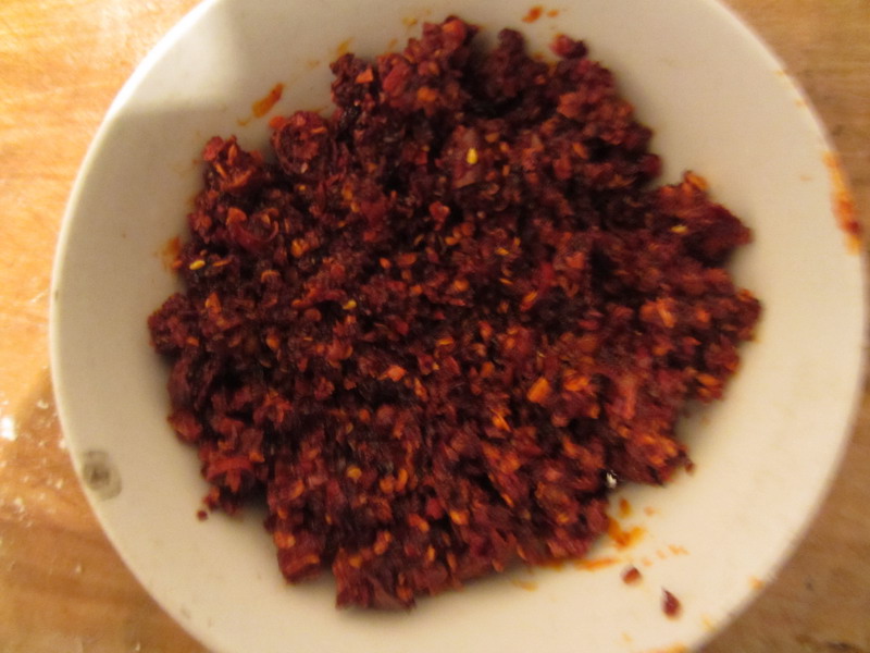 这是为拌面条准备的油炸辣椒,把晒干的辣椒拿擀面杖撵成辣片,然后搀点芝麻,再少放点花椒面,少放点鸡精,搅拌均匀,然后拿长勺把油烧开,倒到辣椒里,再搅拌。这时拌面条的辣椒就炸好了。