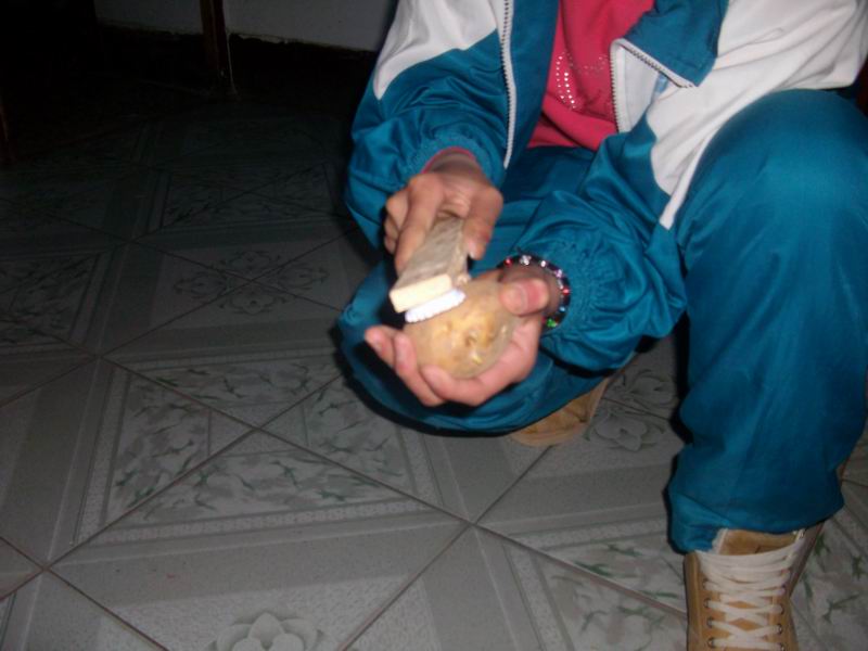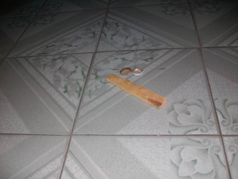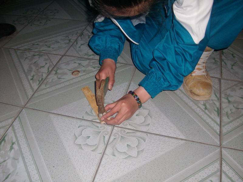 我找来一块光滑的长方形木板、两个瓶盖、一些小铁钉和一把铁锤。先把一个瓶盖底朝上放在木板上面,左手捏着小铁钉,对着瓶盖的中心用铁锤往木板里钉钉子,一不小心铁锤砸了自己的手,疼得我龇牙咧嘴,我忍着疼揉揉手,继续干活。该钉另一个瓶盖了,由于用力不均,钉子好几次钉弯了头,只好一个一个地拔出来,再找一枚重新钉好。最后把木板翻过来,把露出和钉尖铆了回去,这样一件刮鳞器就基本上做好了。