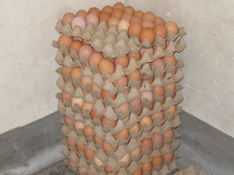 公鸡、鸡蛋可以拿到集市上去销售。这是这家养鸡户从鸡棚收回来 的鸡 蛋,看来,这家人养的鸡开始产蛋了,可以得到经济回报了。