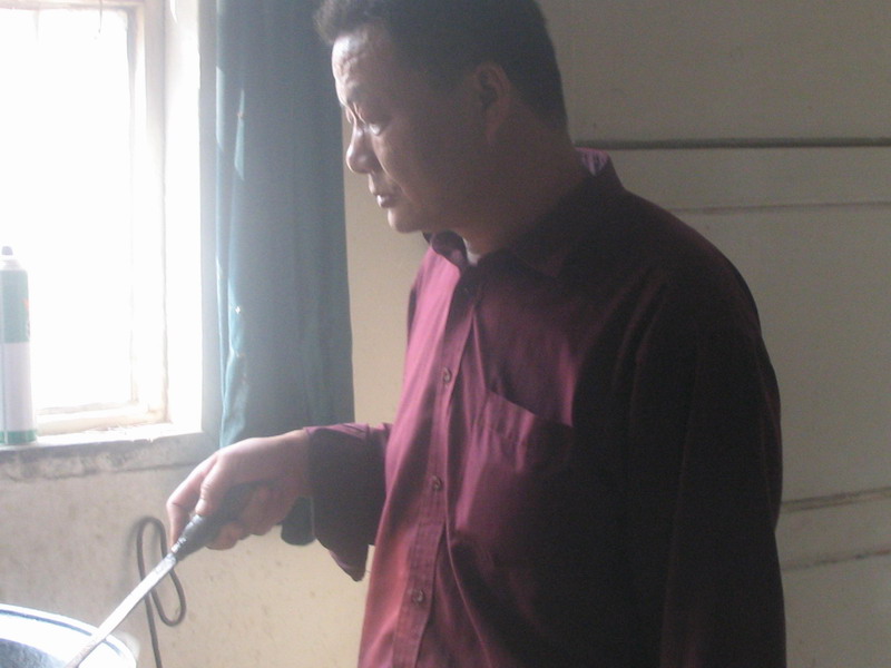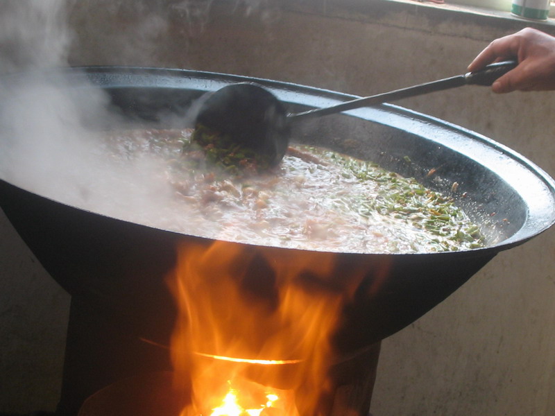 在学生食堂里,有三位师傅作饭,其中,有两位师傅是临时聘请来的。三位师傅每天要负责给二百多名学生作饭。这位师傅是从部队参军转业后来到我们学校的,他正站在灶边作饭,十分专注。