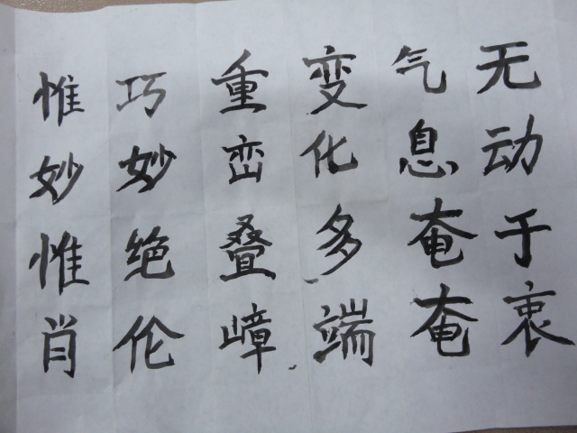 刚开始学习时,我都是临摹字帖,一段时间下来,字体虽有些改观,但进步不大,便心灰意冷了。老师知道后,不断鼓励我,并告诉我书法要用心去练,用心去领会,要持之以恒,就能练好字。老师的话就像春风吹进我的心田,我有了信心,重新拿起了毛笔练习。