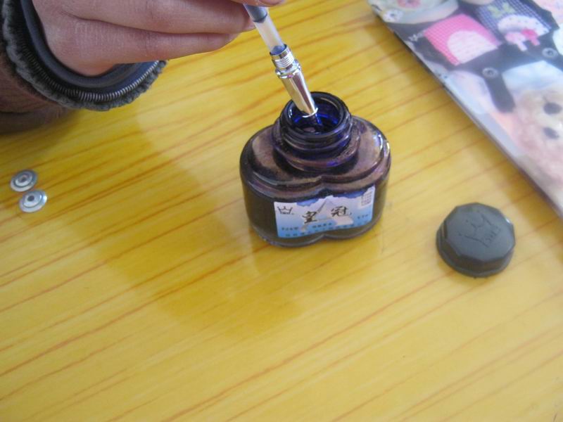 说干就干,我找来一支后面分口的笔管,用卫生纸擦干净。又找来了一个铅笔的小木条。我仔细观察了一下,原来用的那支荧光笔是平头的,我便也把木条用小刀削成了片状。接下来,我又把木条放入笔管中。现在可以用了吧!笔在蓝墨水里泡了一会儿,一试,行,还真不错!