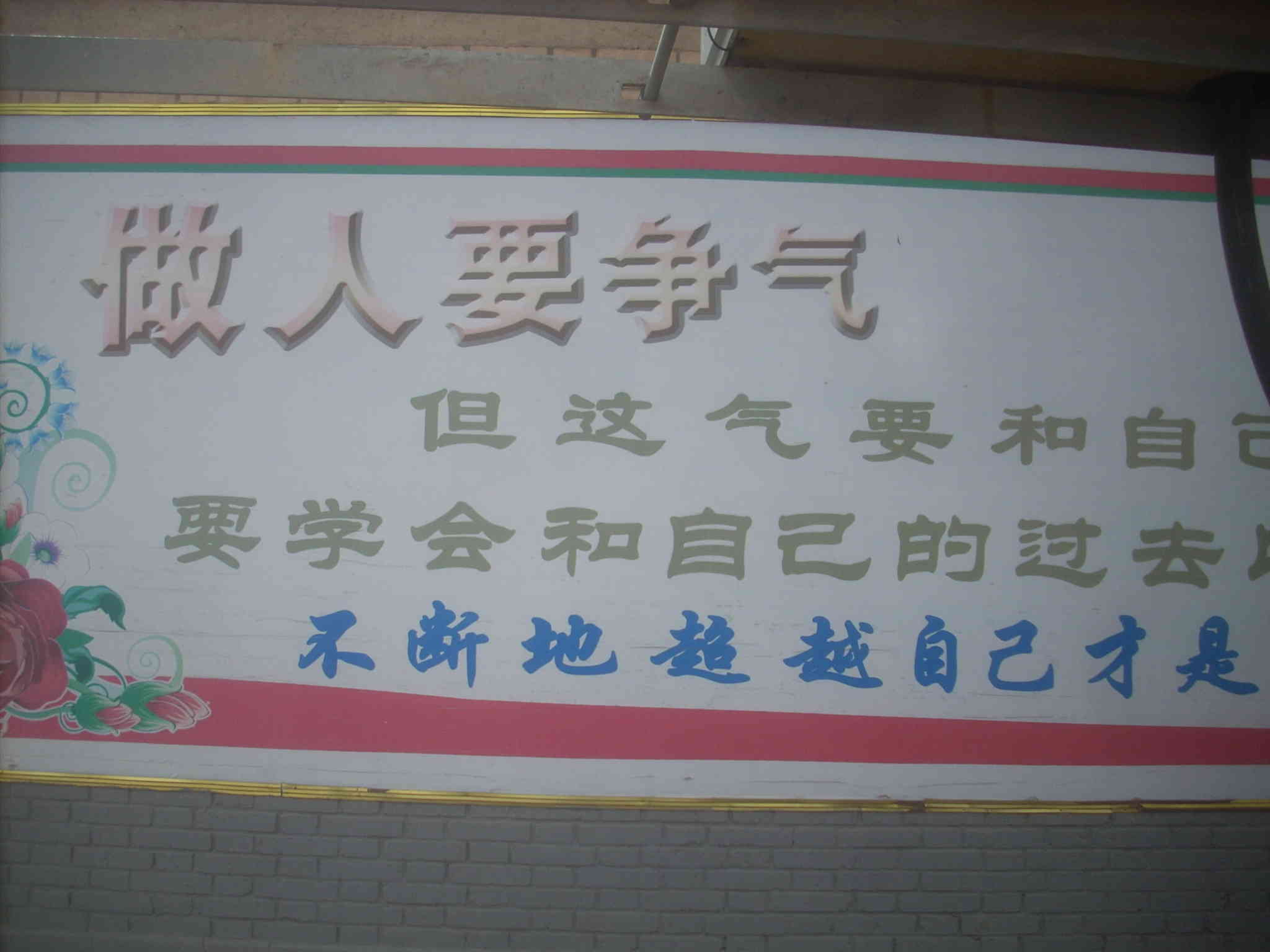 这是我要为大家介紹最后一幅壁画了."做人要争气"五个大字发出金色的光芒.做人是要争气,但这气要和自己争,只有争到自己的气,才有资格去和別人争,不断的超越自己才是人生的真谛.啊,学校的壁画真是多姿多彩呀.