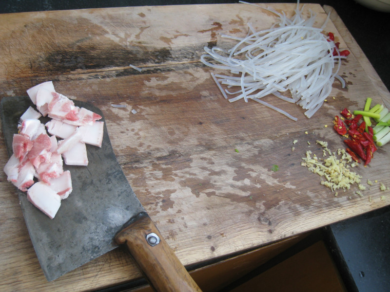 说干就干,我先洗好芹菜和辣椒,放案板上抄起了菜刀,嘿,几刀下去,芹菜竟然变成了歪歪扭扭的几截。我一代神厨怎么能切除这么难看的食材,这让我情何以堪,所以,还是一刀一刀慢慢来吧。经过了一番折腾,终于芹菜切好了,辣椒也在辣了眼睛的情况下切成了丁,接下来就该下锅了。