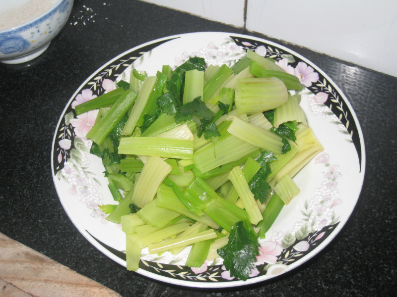 我学着老妈做饭的经验往锅里到了点油,然后看着油一边冒泡泡一边热起来,等袅袅的油烟升起来后,我把芹菜全部倒进了锅里。意想不到的事情突然发生了,芹菜上的水珠一碰油就刺啦啦的就溅到了我的胳膊上,这可苦了细皮嫩肉的我了,疼痛突然感就排山倒海的袭来,痛的我龇牙咧嘴的抱怨了好一会。但是疼归疼,我的午餐还没好呢,不能轻伤就下火线。于是我又抄起了炒勺,盐,酱油,各种调料加进去之后一通翻炒,一会就菜响四溢,满厨房勾人魂魄的香味了。出锅,本大厨的第一道菜,大家看看,怎么样哈,嘿嘿,还不错吧,要吃吗?不给吃,自己学着做去!
