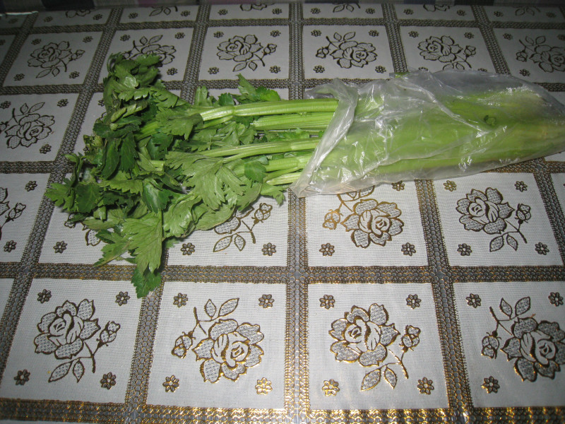 首先,要准备食材。可恶的老妈竟然没买什么菜,偌大的厨房只有两根孤零零的芹菜。这可难为我了,本来还想大展一番身手的,这好厨子没料我也不能干煮一锅水当汤喝啊。不过也罢,芹菜就芹菜吧,绿油油的也算"绿色食品",营养相当丰富。所以,做一顿营养午餐是没有问题了。