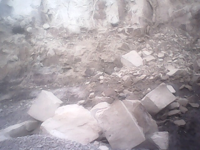 图中有一块块大型的碎石.这是用来干什么的呢?原来,开采石头出来是为了用地修建房屋,石头也可用来建房。 整个山体被截下来一块,只为了那几百平方的建筑用地。
