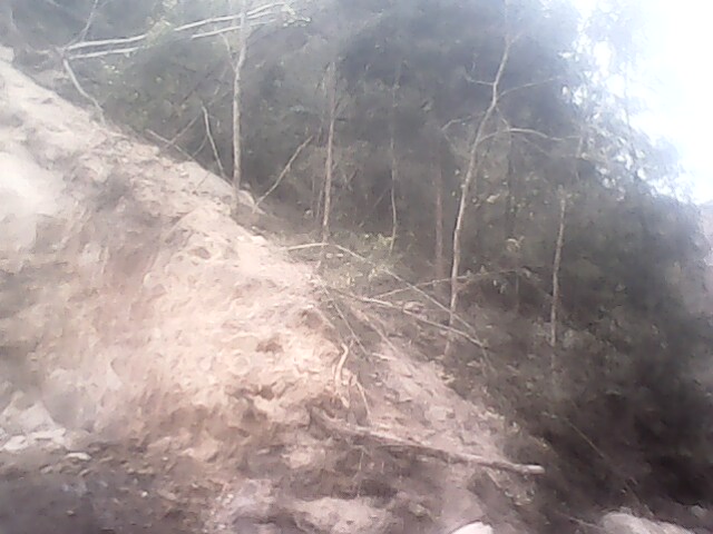 雨后,山上斜坡被开采的旁边裸露土壤顺着雨水留下来了,边缘是被折断的树木,随意丢弃在一旁。