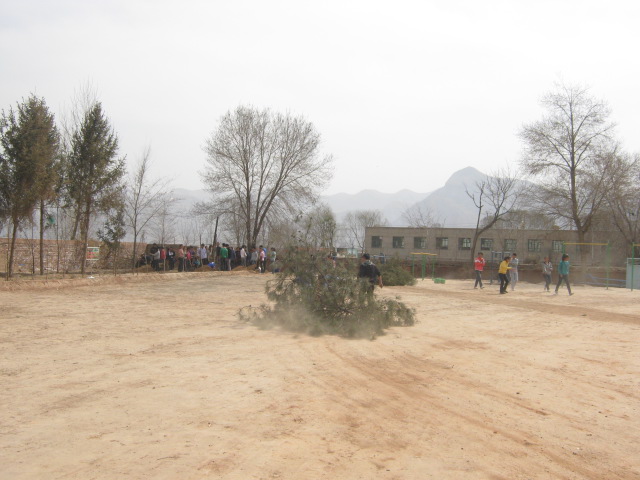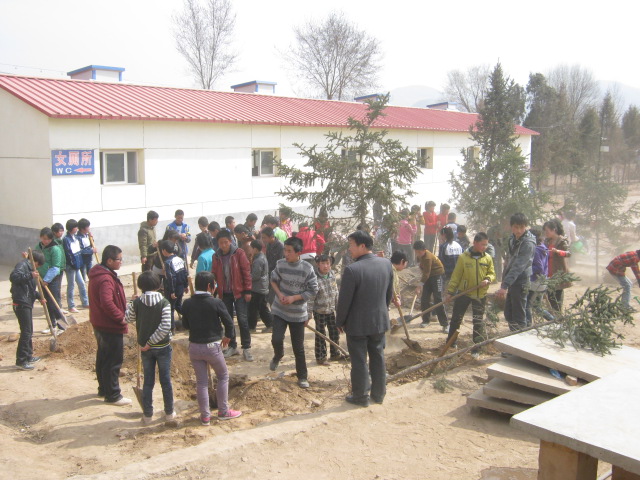 全校的同学都在植树,所以操场上热火朝天,很多老师也来参加劳动了,他们给我们指导如何挖坑。