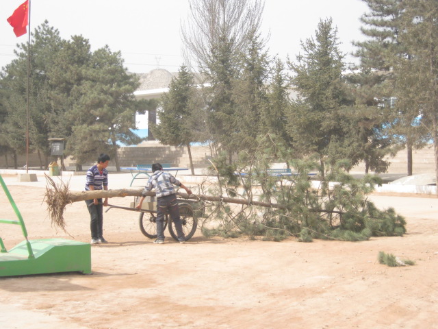 我们的树坑快挖好的时候,班主任让几个同学去把要栽的树苗用架子车拉过来。由于树木有两三米高,所以几个同学拉的时候非常的吃力。