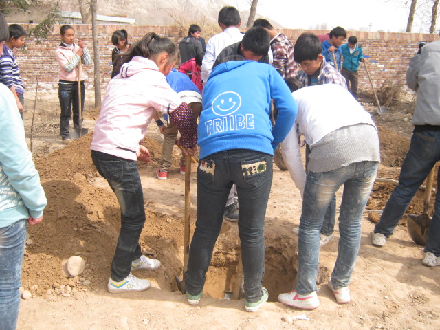 我们全班同学围在一起,今天的任务就是植树,男同学一个树坑,女同学一个树坑,我们四五个女生围着一个树坑,用铁锹一点一点的挖。