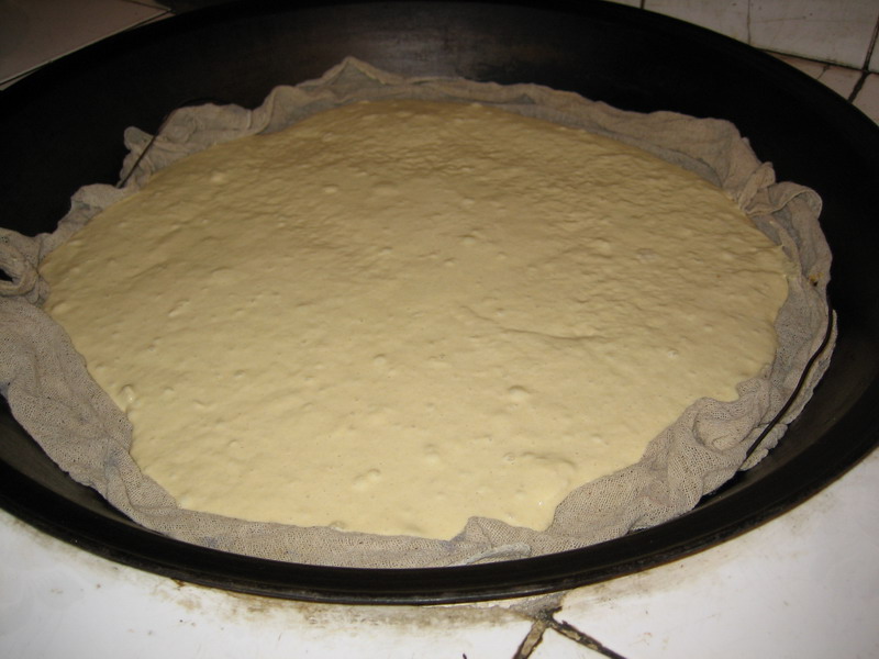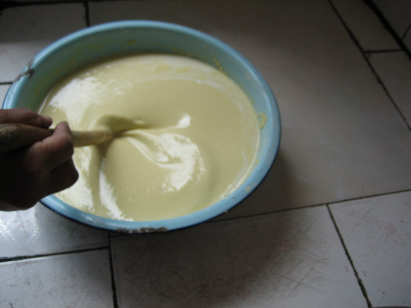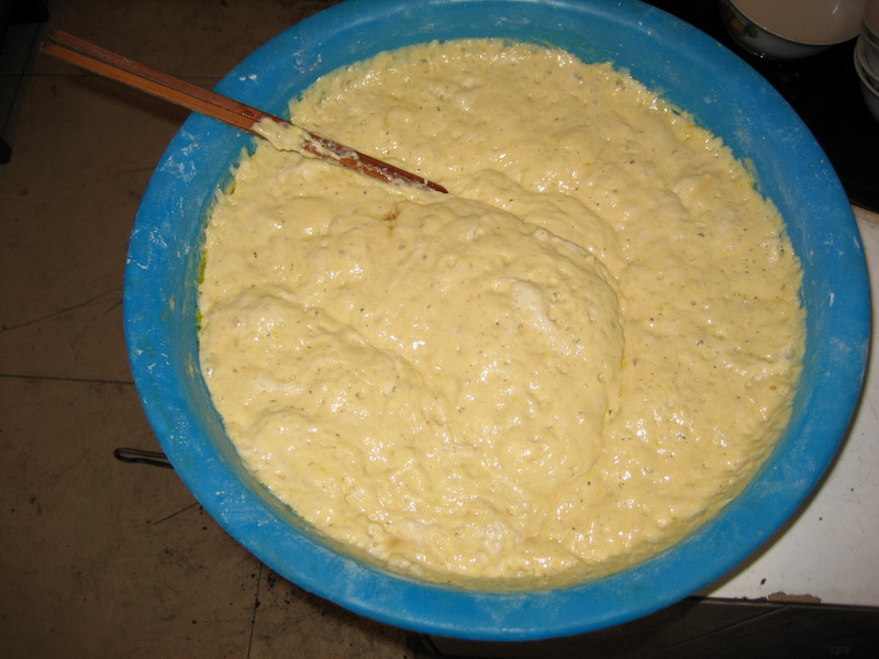 准备好配料后,接下来就是和面了,把预先准备好的麻油、白糖、牛奶、鸡蛋搅拌均匀后,再放入莜面、玉米面与小麦粉加水和成稠糊状,放到40度左右的地方进行发酵,完全发酵(4至5 小时)后就可以进行下一步了。