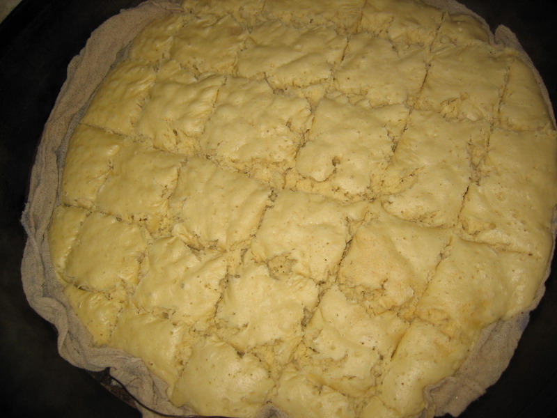 把准备好的小苏打完全溶入少量的水中,倒入稠糊状面内,用筷子把小苏打水与稠糊面搅拌均匀后,把稠糊面倒入铺好笼布的笼屉内,用铲子把稠糊面弄成溥厚均匀的稠面饼。