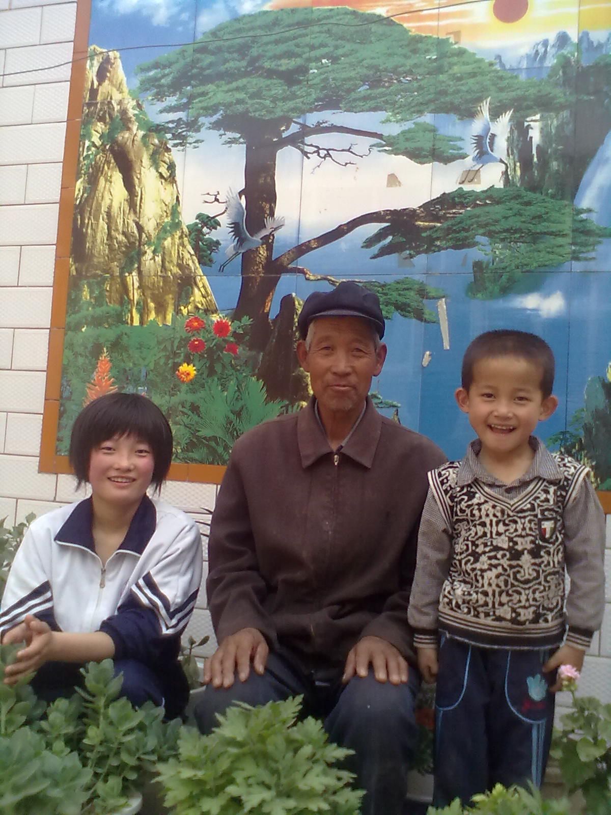 她的爷爷很慈祥也很健谈,我们聊了很久。我提出给老人和两个孩子照张照片,老人立刻搬了小凳子坐在花园中间,摆了正襟危坐的动作。