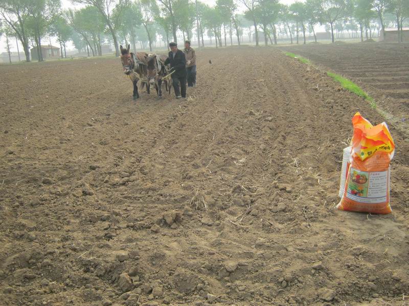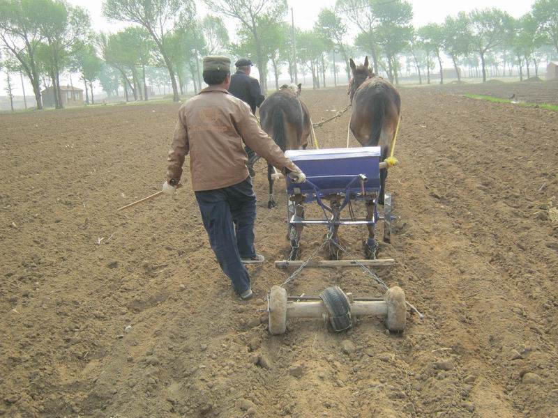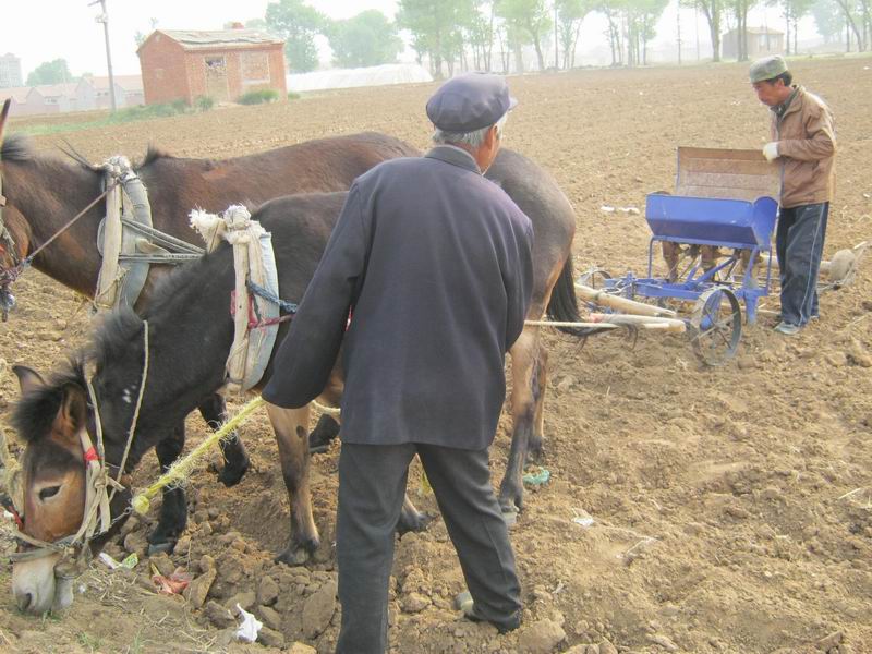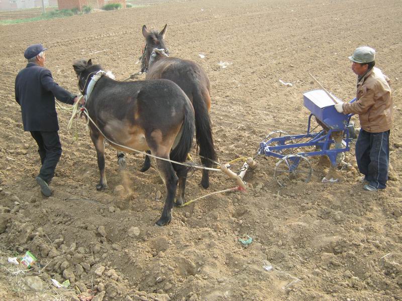 一个白发苍苍的老大爷指了指那两匹牲口对我说:"这样种出的地好 。不像拖拉机四个轱辘把地压的很实,地就特别的硬庄稼就长不好。再说拖拉机回头拐弯的不方便要坏好多地,现在地少了我们不舍的扔地啊。"