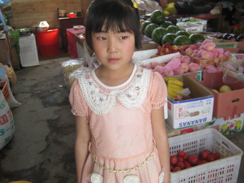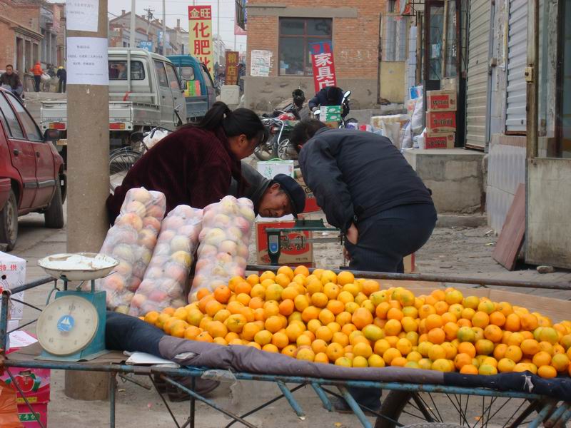 男青年怔怔地站在那儿,望着小姑娘远去的背影,突然男青年像想起了什么似的,赶紧抓起几个大桔子向小姑娘追去,小姑娘已经消失在拥挤的人群中……