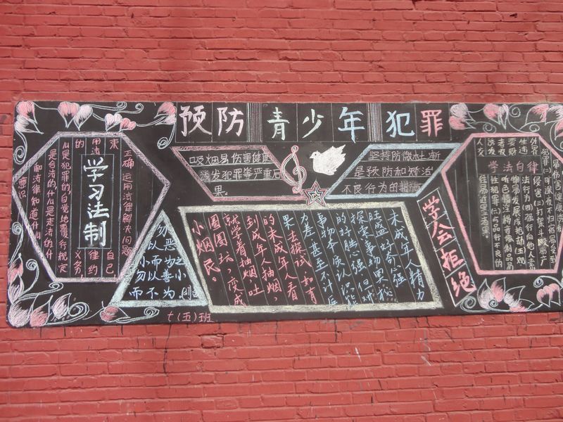 为了更好地宣传法律知识,让每一个中学生知法、懂法、守法,预防青少年犯罪。学校团总支安排七年级五班刊出了一期有关法律知识宣传的板报。板报设计新颖、布局科学、内容详实。融入了七五班学生的智慧和心血,班主任杨老师亲自上阵,给学生们出主意想办法,怎样设计版面、怎样选材、怎样构图,每一步都做到精益求精。板报刊出以后,得到了学校师生的广泛好评。同时也很好地对学生进行了一次法制教育。