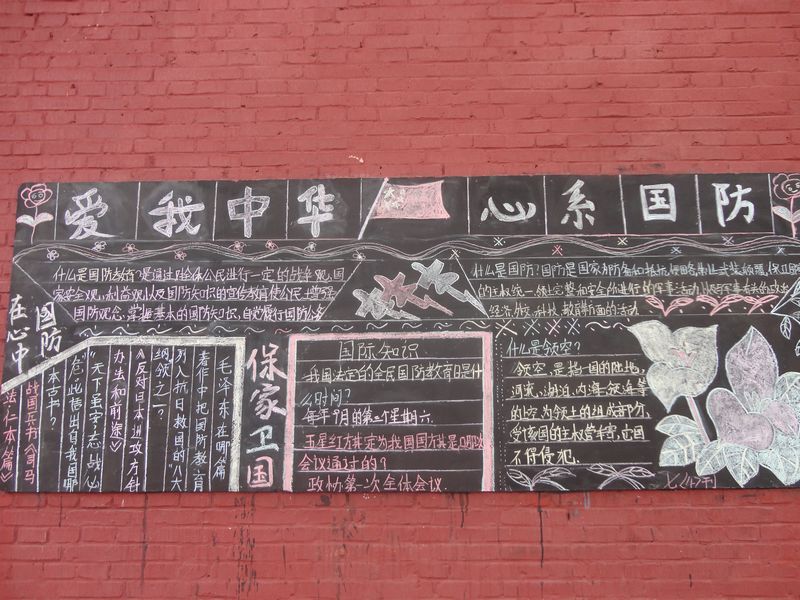 什么是“国防”?什么是“国防教育”? 对于我们七年级的学生来说还有些模糊,前一段时间,我们学校专门组织学生学习和了解了“国防”知识,并且还进行了“国防”知识竞赛,很好地对全校学生普及了“国防”知识。学校团总支安排我们七年级四班刊出一期有关“国防”知识的板报,同学们集思广益,从材料的选择、版面的设计等方面精心策划,看出了一期高质量的板报,得到学校领导的和学生的好评。