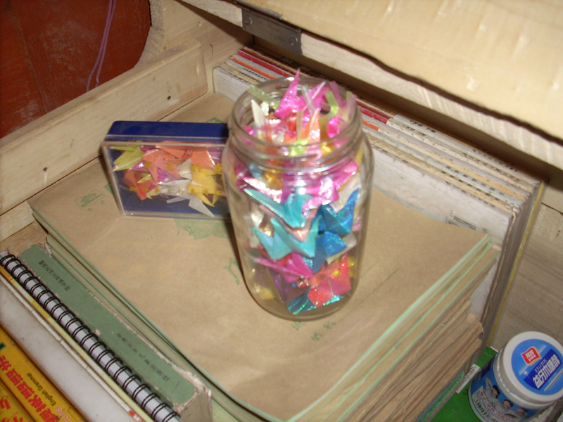 在它的左侧放的是我最喜爱的一些小东西。其中有两个塑料瓶里放的是我在假期中叠的五角星和千纸鹤。在一个半透明的小盒里是我收集的卡通画将近70多张,还有一个黄色的小纸盒里是我的学习用品,一个彩色的小纸盒里是我的小学毕业证和一些在元旦节送的小卡片。