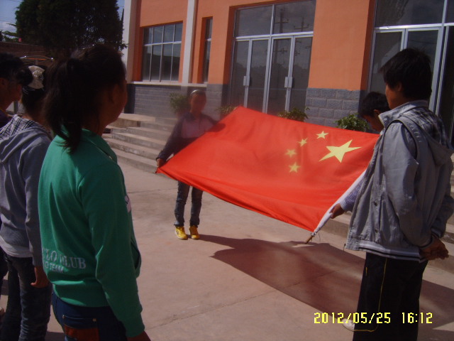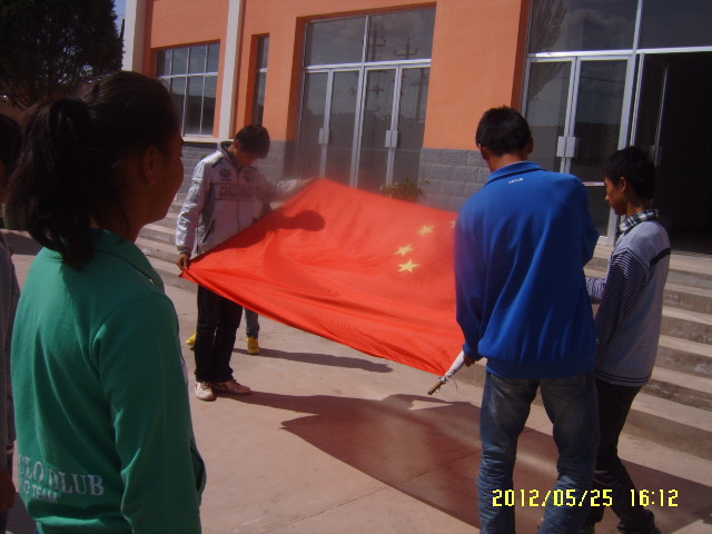 他们先教我们如何牢固的把国旗挂在上面,九年级的棋手在上面演示,我们站在旁边认真的看着。当他们演示完了以后,我们自己操作了一下,这个应该说比较简单,我们只试了一次就成功了。