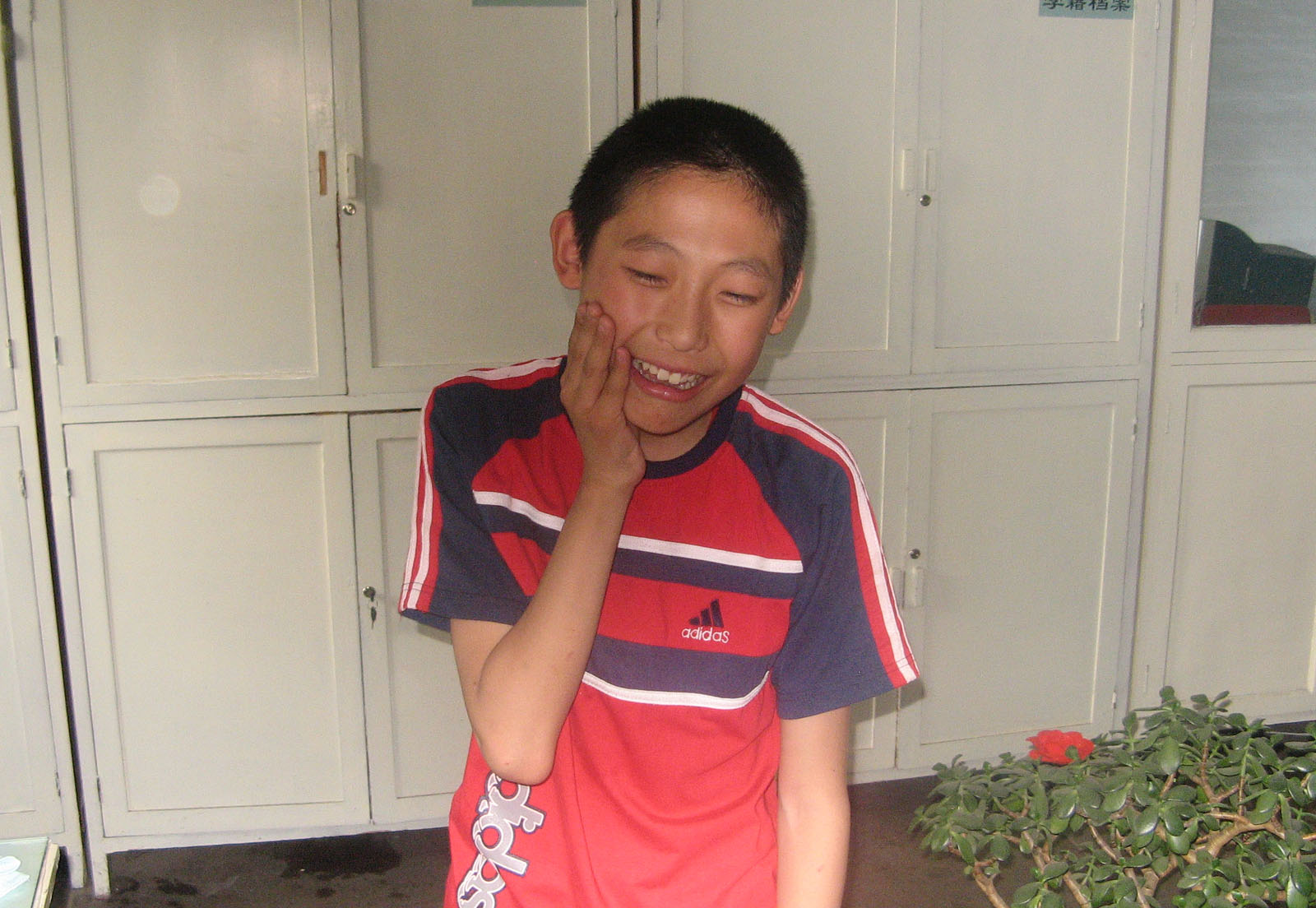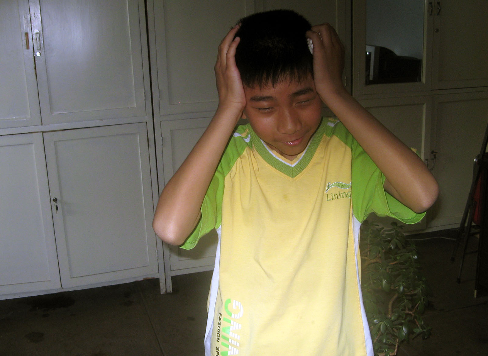 剩下在那儿等的同学,见他真的去告状了,怕他赢了自己,竟着急忙慌地跑去办公室揭穿他告假状的行为。没成想,跑得太急竟撞到了门框上,把头上撞了一个包。