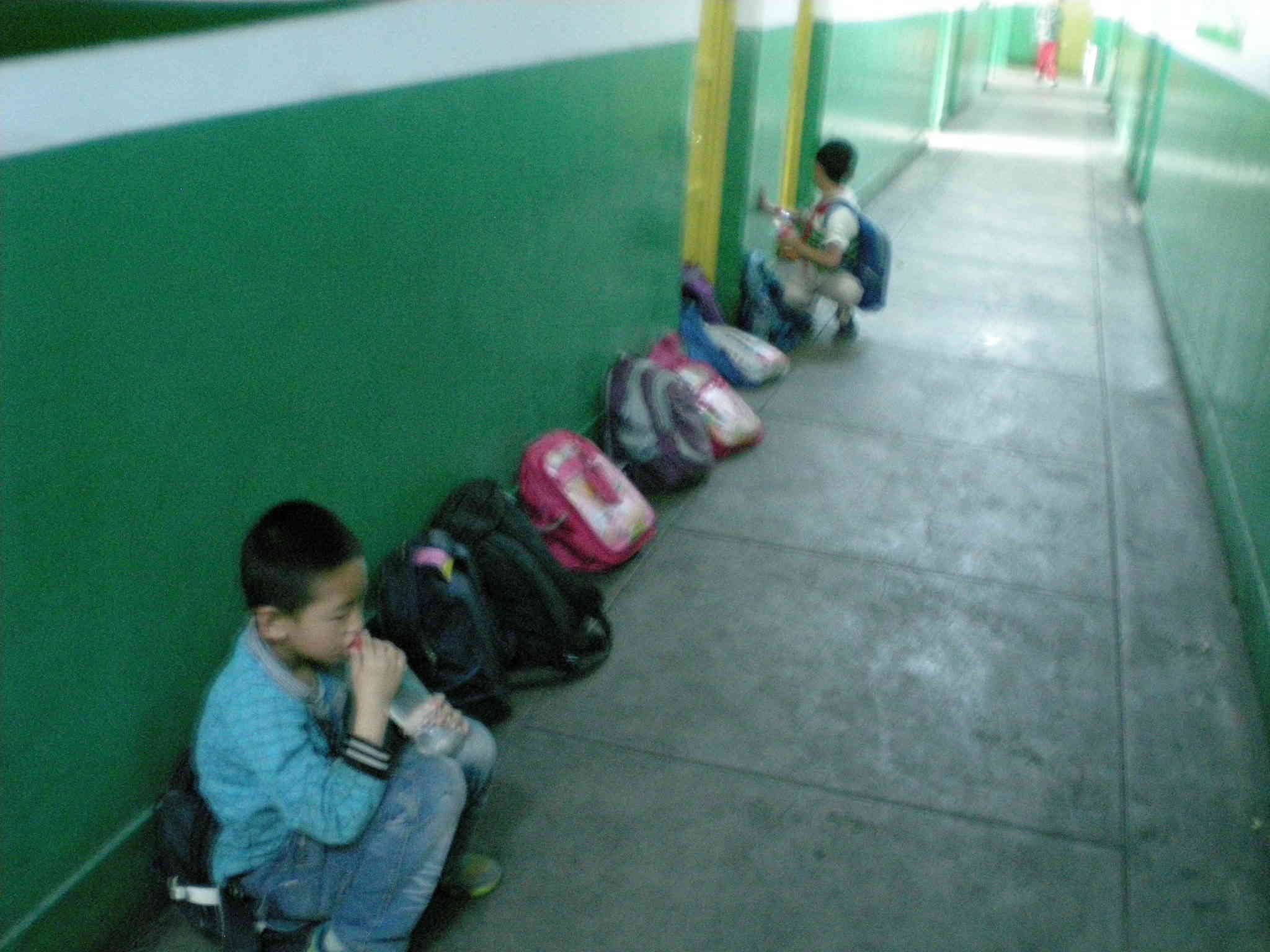 早来的孩子,有的是因为家里太忙,早早把他们送到学校。他们在校园里啃着烧饼、面包。