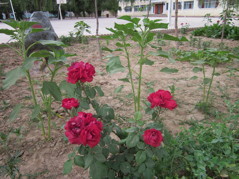 可不是我们偷懒不种花,这些都要拜花园里的盐碱土所赐,种什么都不会生长,都会被土地里过多的碱烧死。可是这样的校园的确缺乏生机,太不美观了。于是今年春天我们狠下决心,每个班都在班主任的带领下把各自花园里的土换了一下。这可是大工程啊,我们整整忙了一个下午。但为了咱们学校,每个同学都卖力的干着。