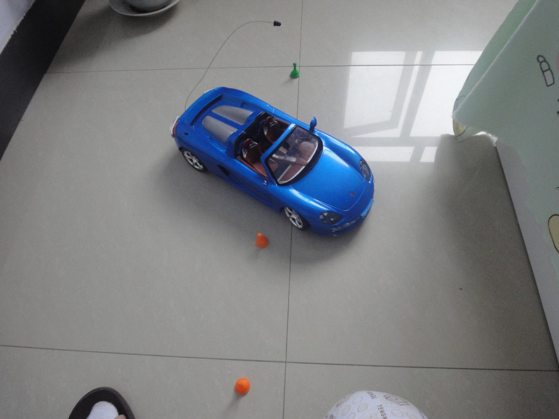 这辆车是蓝色的,上面真是样样都有,车门,倒车镜,车灯,排气管,连雨刷都有,车里面还有方向盘,变速杆,实在是要什么有什么。