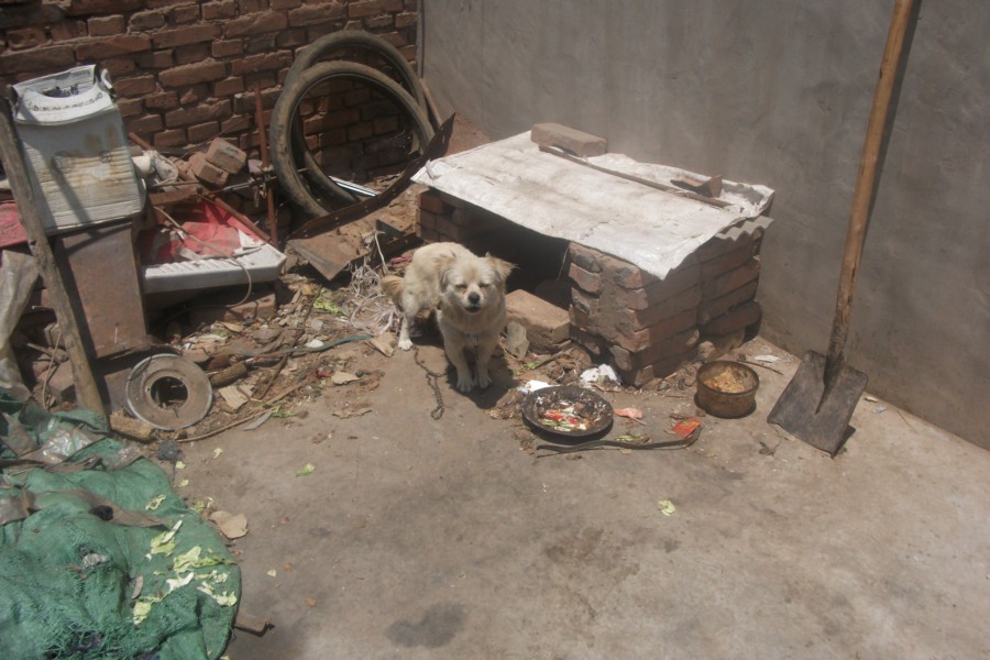 狗狗非常贪吃,像金鱼一样,只会吃,不懂饱,有一次,它吃的太多了,整个肚子鼓鼓的,像青蛙一样,只好乖乖地躺在地上一动也不能动。我们不在家的时候,它把家搞得一塌糊涂,把家里的纸撕破。它把鞋叼到别的地方或着咬鞋。有一次,它把我的凉鞋叼到门外去,害得我到处都找不着。